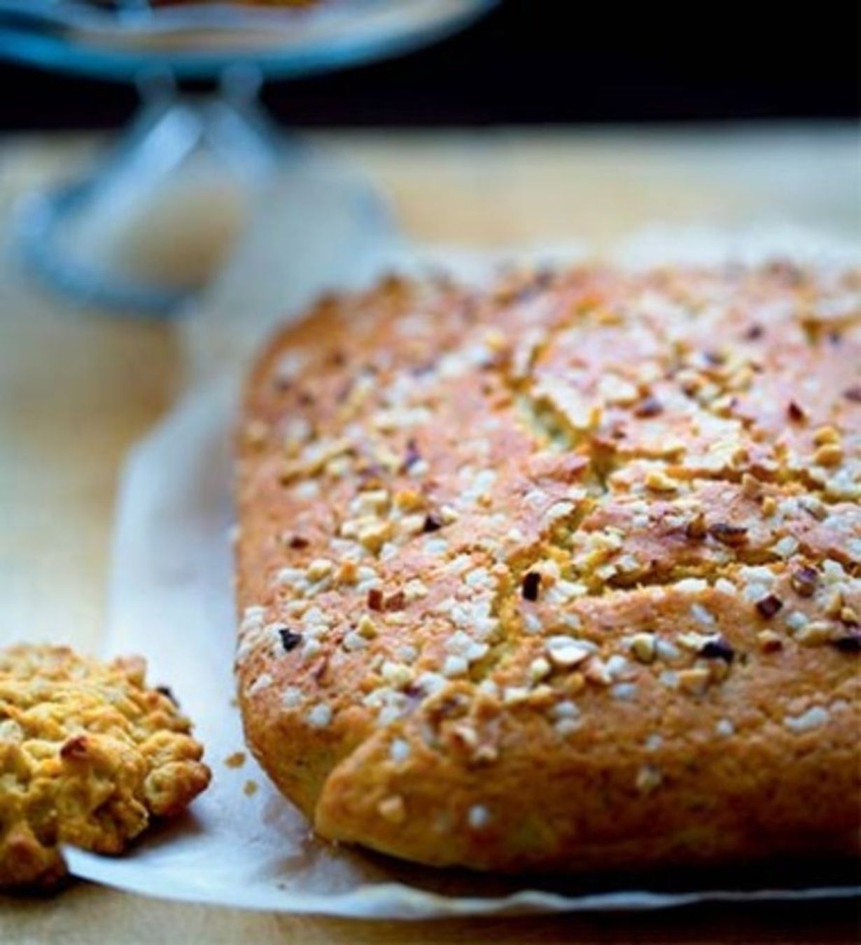 - Kaada taikina voideltuun tai leivinpaperilla vuorattuun pyöreään tai suorakaiteen muotoiseen uunivuokaan (halkaisija noin 22 cm tai 20 x 30 cm). Ripottele pinnalle raesokeria ja halutessasi pähkinärouhetta.