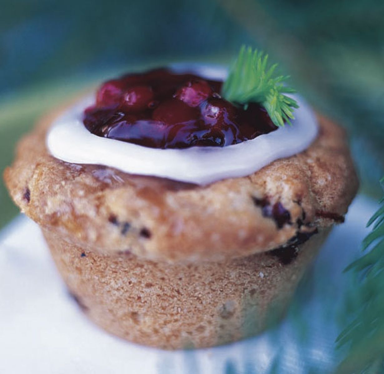 Sekoita tomusokeri ja vesi. Laita seos pursotinpussiin ja tee rengas puolukkakoristeen ympärille. Koristele muffinit kuusenkerkillä (uusi, vaaleanvihreä kasvutupsu kuusenoksan päässä) tai puolukanvarvuilla.