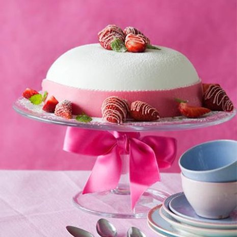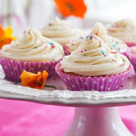 - Siivilöi joukkoon tomusokeri ja värjää kuorrute vaaleanpunaiseksi. Ohenna tarvittaessa vedellä. Vatkaa käsivatkaimella kuohkeaksi.