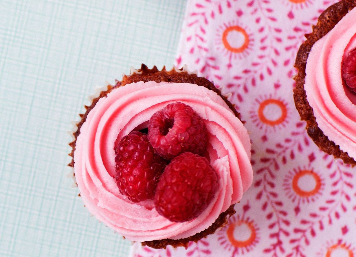 - Laita seos pursotinpussiin ja pursota kiehkuraksi muffinin päälle. Koristele tuoreilla vadelmilla.