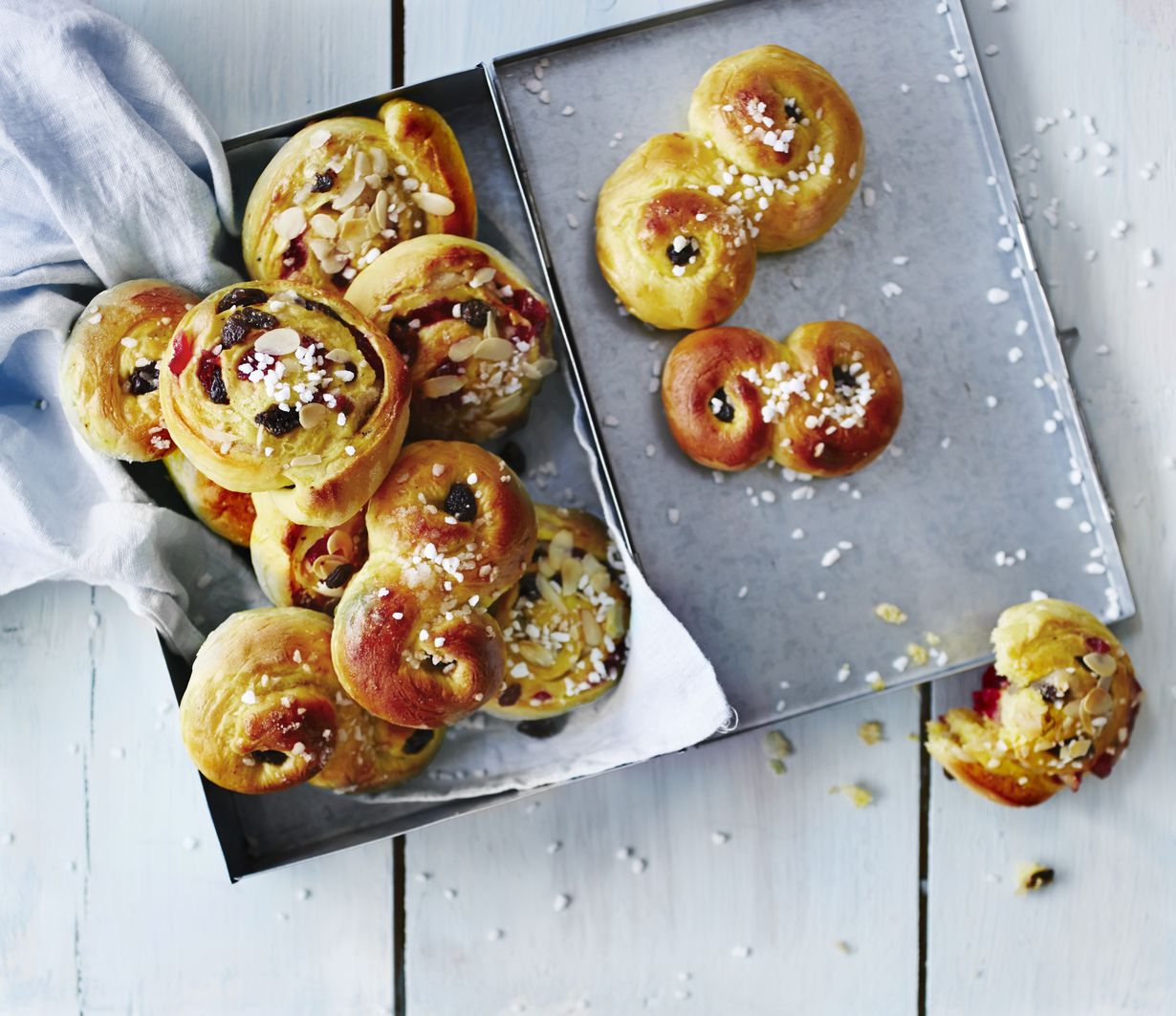 - Voitele pullat munalla. Paina rusinat sahramipullien päihin. Ripottele kierrepullien pinnalle raesokeria ja mantelilastuja.