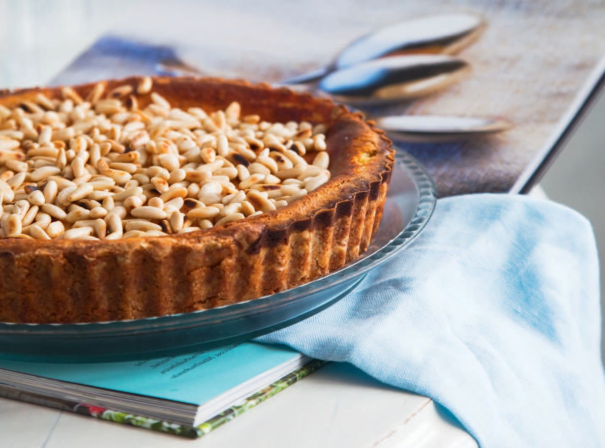 Italialainen sitruunapiiras viimeistellään pinjansiemenillä.