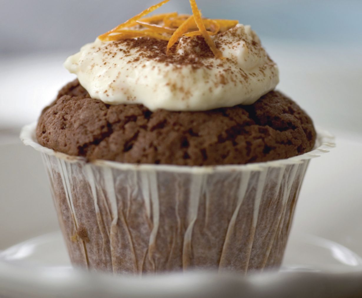 - Paista 225 asteessa uunin keskitasolla noin 15 min. Koristele jäähtyneet muffinit appelsiinituorejuustolla.