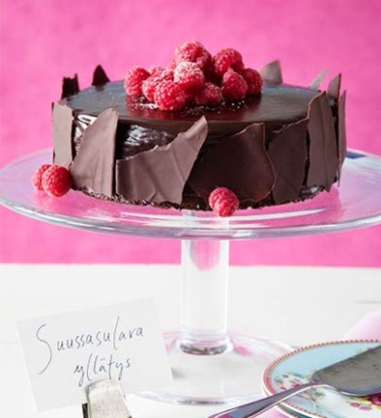 Koristeluvinkki! Sulata 150 g tummaan suklaata mikrossa ja levitä ohueksi levyksi leivinpaperille. Anna kovettua viileässä. Murra erikokoisia ”laattoja” levystä ja kiinnitä ne kakun reunoille, kun kuorrutus on vielä pehmeää.
