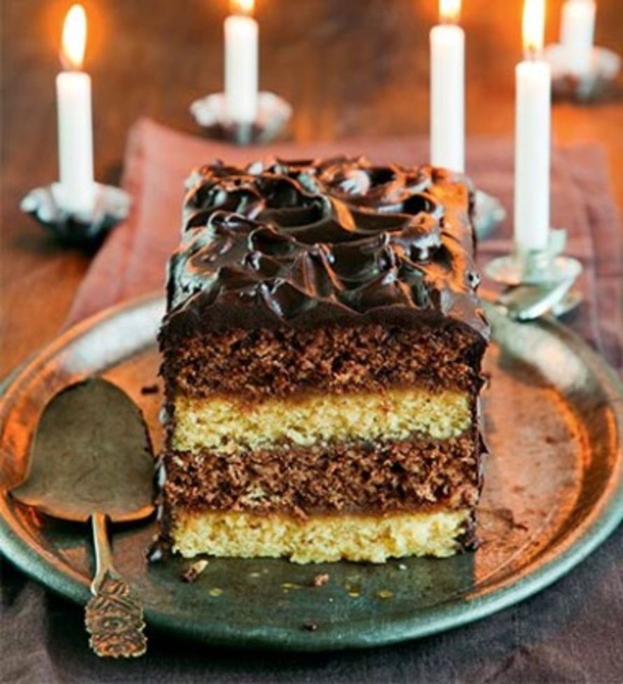 - Kaada ruskea taikina toiseen vuokaan tai pellille ja valkoinen toiselle. Paista uunin alatasolla noin 20 minuuttia tai kunnes levyt ovat kypsiä. Anna jäähtyä. Leikkaa kakkulevyt samankokoisiksi, suorakaiteen muotoisiksi paloiksi. Kostuta halutessasi kevyesti appelsiinimehulla.