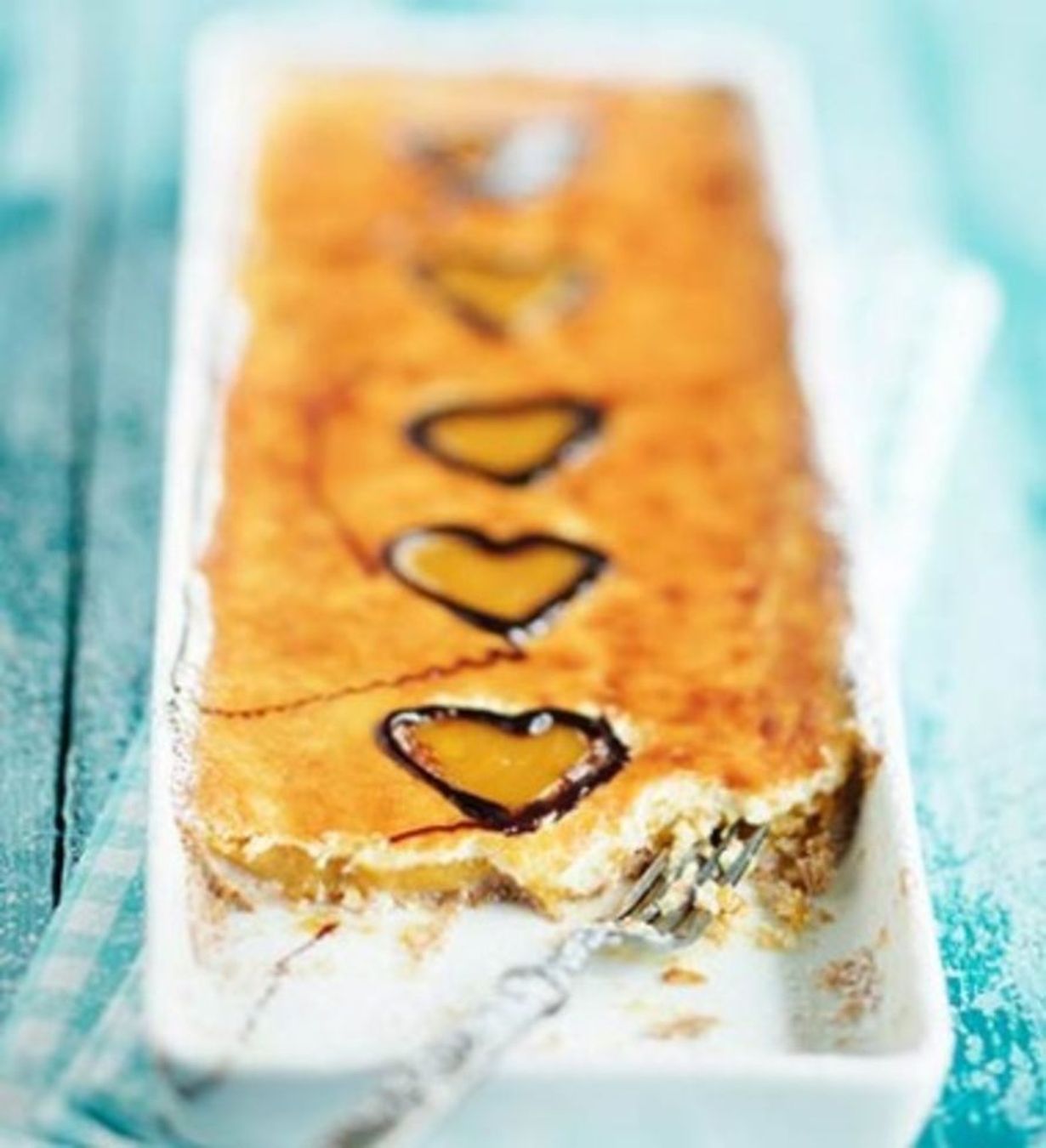 Vinkki! Voit leipoa piirakan myös pitkulaiseen tai neliön muotoiseen vuokaan. Käytä silloin useampia pieniä muotteja. Kun piirakka on jäähtynyt, voit koristella sydänkuvion reunat sulalla suklaalla ja piirakan reunat tomusokerilla.
