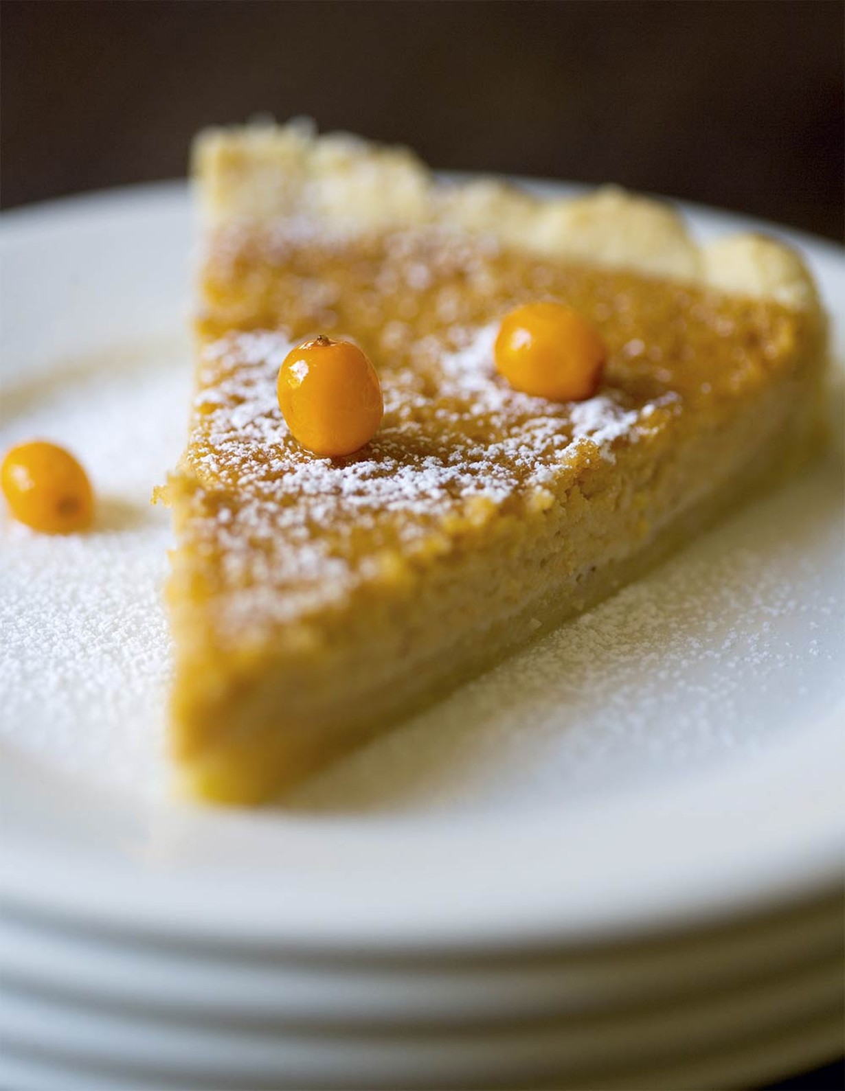 Kypsennä piirakkaa uunin alatasolla 200 asteessa noin 30 minuuttia eli kunnes täyte on hyytynyt. Koristele piirakka tomusokerilla ja tyrnimarjoilla.