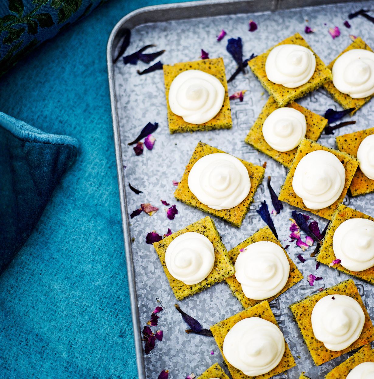 - Leikkaa unikonsiemenkakku annospaloiksi. Pursota päälle kardemummakreemiä.