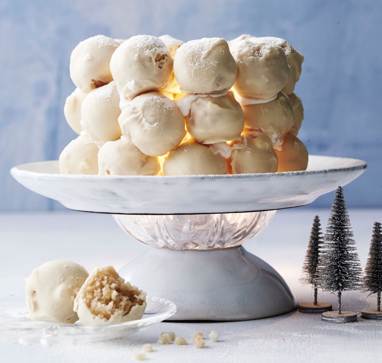 Pyörittele valkosuklaakuulista herkullinen lumilyhty joulun kahvipöytään.