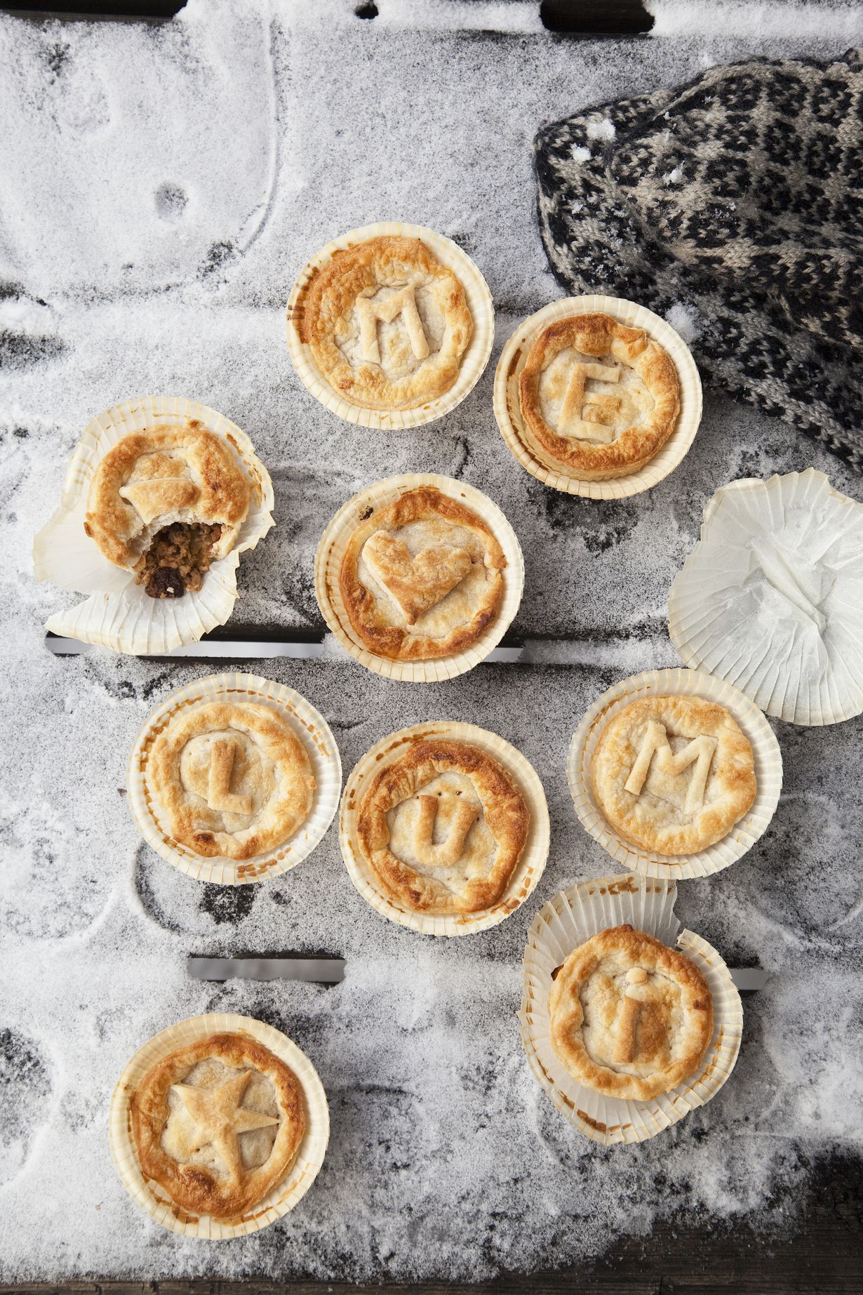 Ota taikinasta ympyränmuotoiset kannet. Leikkaa lopusta taikinasta halutessasi terävällä veitsellä tai pienellä piparimuotilla piiraiden koristeeksi kirjaimia tai kuvioita.