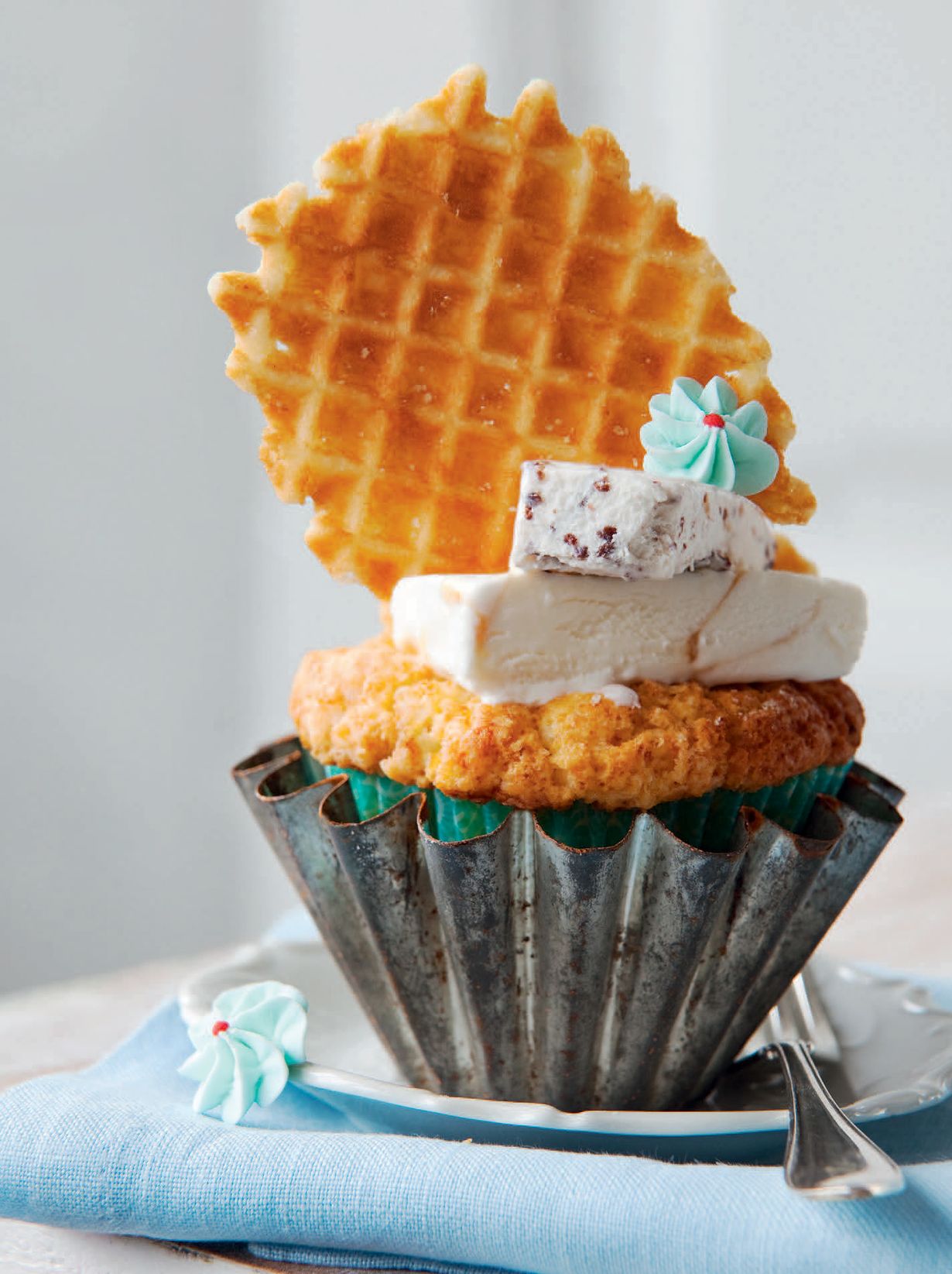 Vaniljajugurtti mehevöittää muffinitaikinan ja jäätelö kruunaa helpon herkun. Käytä taikinaan tavallista, sokerilla maustettua vaniljajugurttia, sillä kevytjugurtin makeutusaine antaa ei-toivottua sivumakua.