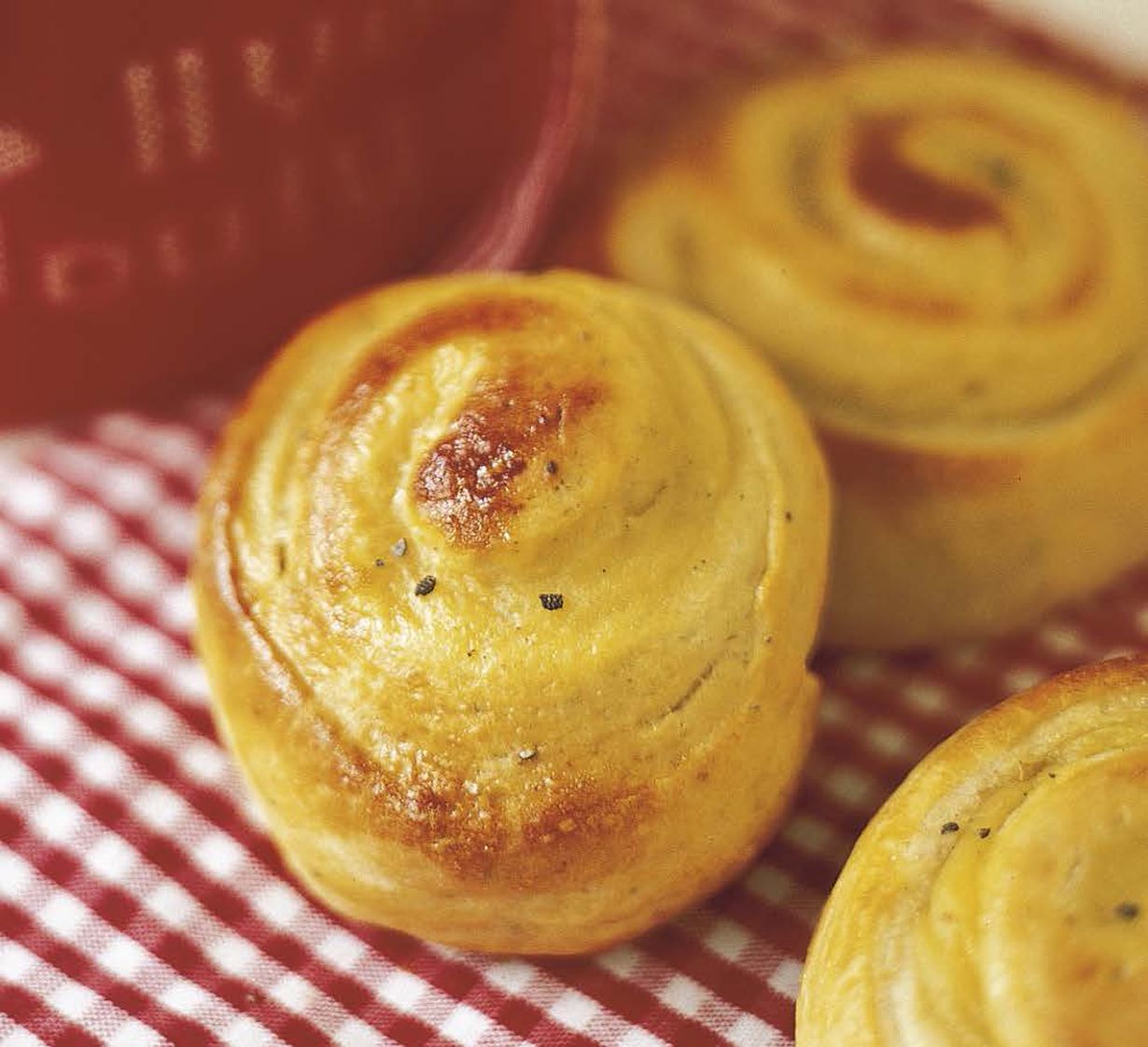 - Leikkaa rulla parin sentin levyisiksi pulliksi ja nosta pullat kohoamaan leivinpaperin päälle uunipellille leikkuupinta alaspäin. Kohota liinan alla 15 minuuttia. Voitele munalla.