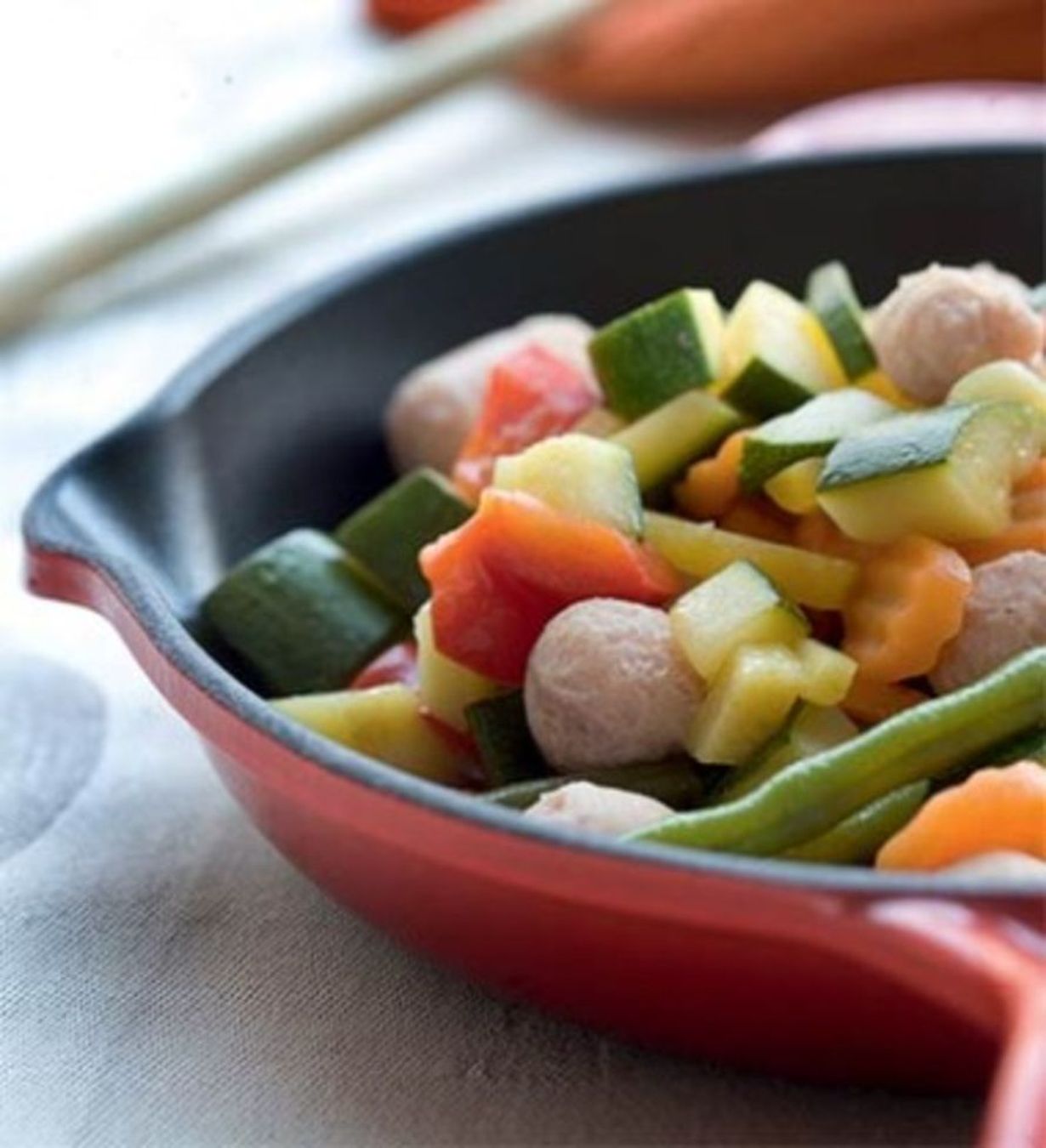 - Kuutioi kesäkurpitsa ja puhdistettu paprika. Kuullota kasviksia paistokasarissa muutama minuutti. Lisää jäiset pakastekasvikset ja jatka paistamista hetki. Mausta ja kaada sekaan vesi.
