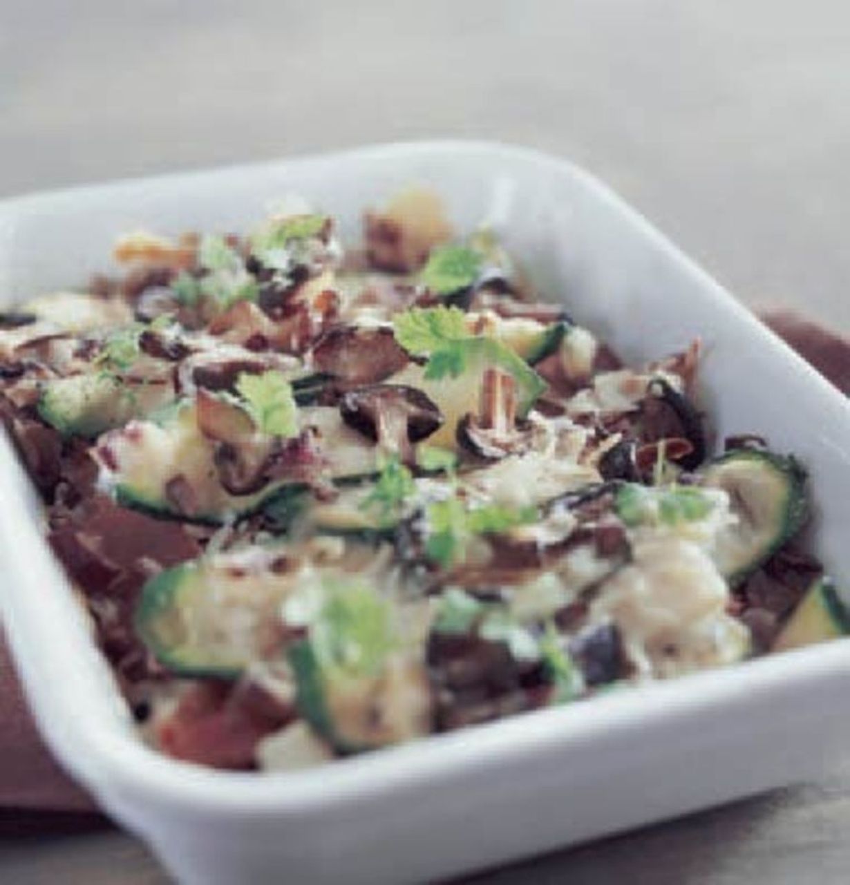 - Lado uunivuokaan vuorotellen kesäkurpitsaviipaleita ja paahdettua parmankinkkua.