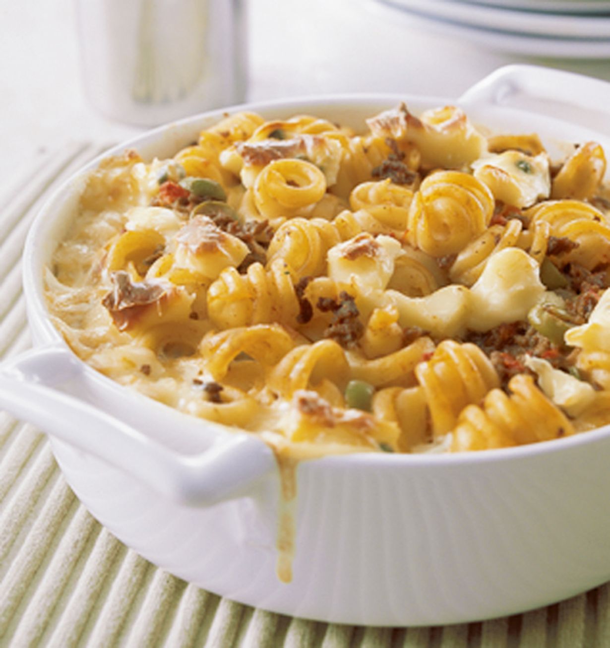 Sekoita pastakattilassa valutettu pasta ja jauhelihaseos. Kaada voideltuun uunivuokaan. Ripottele pinnalle murennettu viherpippurijuusto.