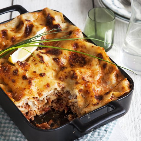 Pane päälle kerroksittain lasagnelevyjä, kala-äyriäisseosta ja juustoraastetta. Viimeinen kerros saa olla kastiketta ja juustoraastetta.