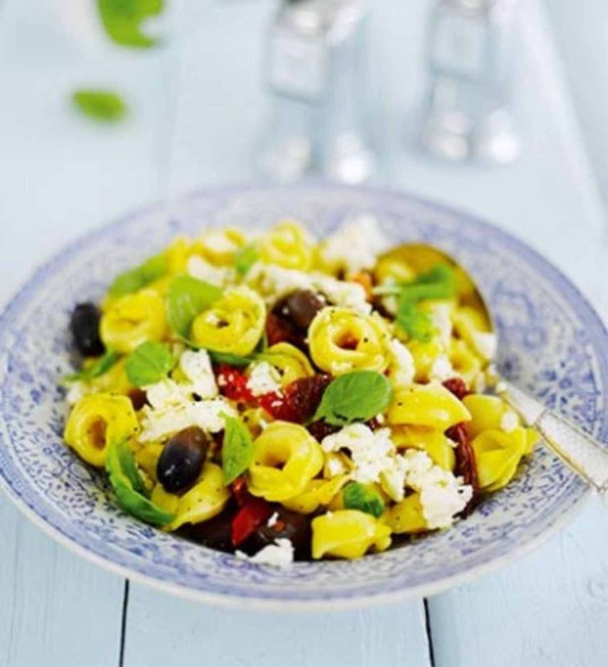 - Keitä tortelliinit pakkauksen ohjeen mukaan. Valuta keitinvesi pois ja laita pasta kulhoon. Kaada päälle öljy ja lisää paprikat, tomaatit ja oliivit. Murustele joukkoon feta. Sekoita varovasti.
