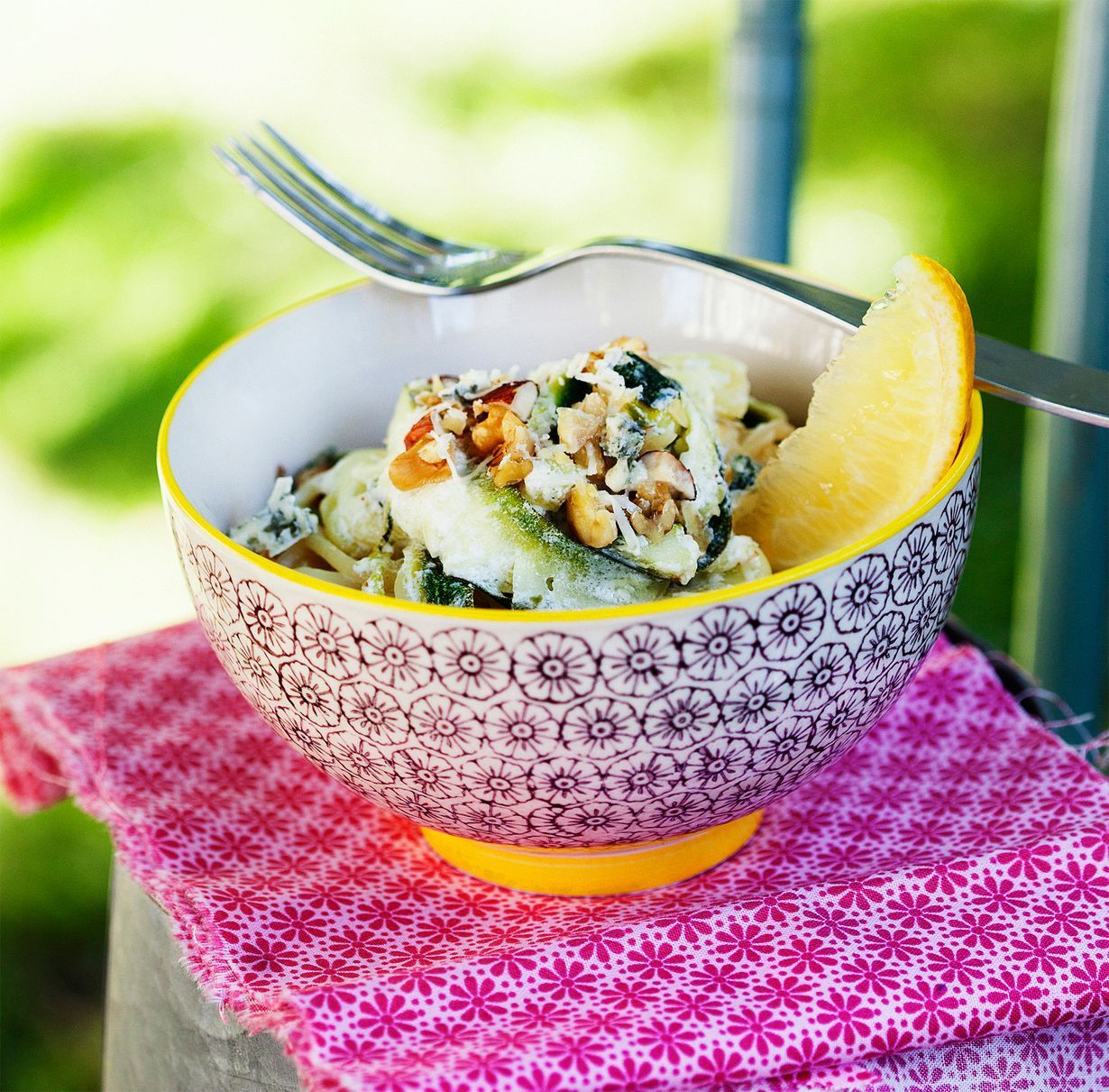 - Paista kesäkurpitsa, valkosipuli ja chili pannulla tai kattilassa pehmeäksi. Lisää jogurtti ja juusto sekä pähkinät. Kuumenna muutama minuutti. Sekoita kastike ja pasta. Tarkista maku ja lisää halutessasi suolaa tai sitruunamehua. Koristele annokset juustolla ja pähkinöillä. Tarjoa heti.