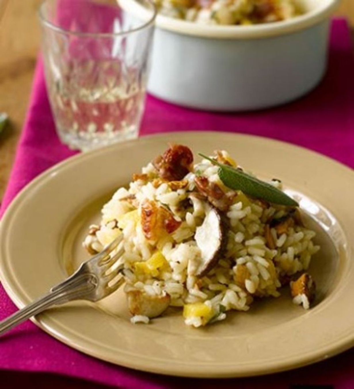 Vinkki! Voit halutessasi jättää kurpitsan pois. Risoton voi valmistaa myös kuivatuista sienistä. Liota noin ½ dl kuivattuja sieniä haaleassa vedessä noin 30 minuuttia. Valuta. Silppua sienet ja säästä liotusliemi. Hyödynnä liemi risotossa. Lisää sienet risottoon valmistuksen alkuvaiheessa, heti kun viini on imeytynyt riisiin.