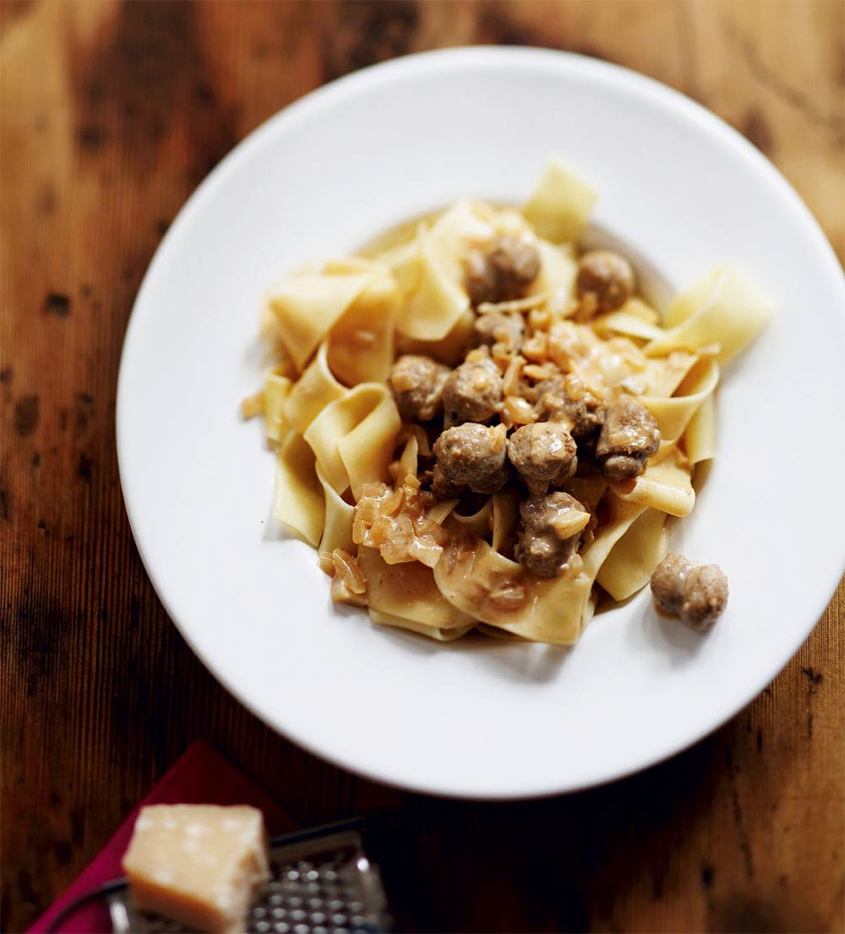 Saksi makkarat suoraan pannulle ja ruskista kevyesti. Kaada sekaan kerma. Mausta ja anna hautua hetki. Keitä pasta pakkauksen ohjeen mukaan al dente. Sekoita kastike pastaan ja ripottele päälle vasta raastettua parmesaania.