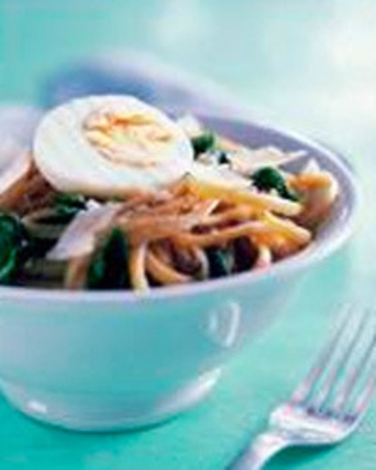 - Kun spagetti on valmis, valuta lävikössä. Kaada heti hiukan märkänä kattilaan (ei levyllä). Kaada rikotut munat päälle, sekoita pinaatti sekaan ja lorauta öljyä päälle. Sekoita, sillä kuuma spagetti hyydyttää munan.