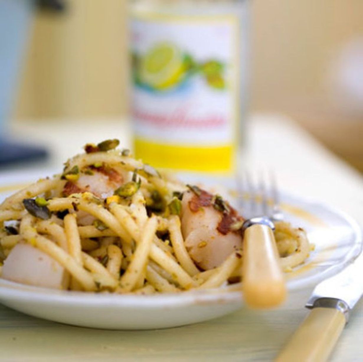 Pastaa, kampasimpukoita ja sitruunapestoa