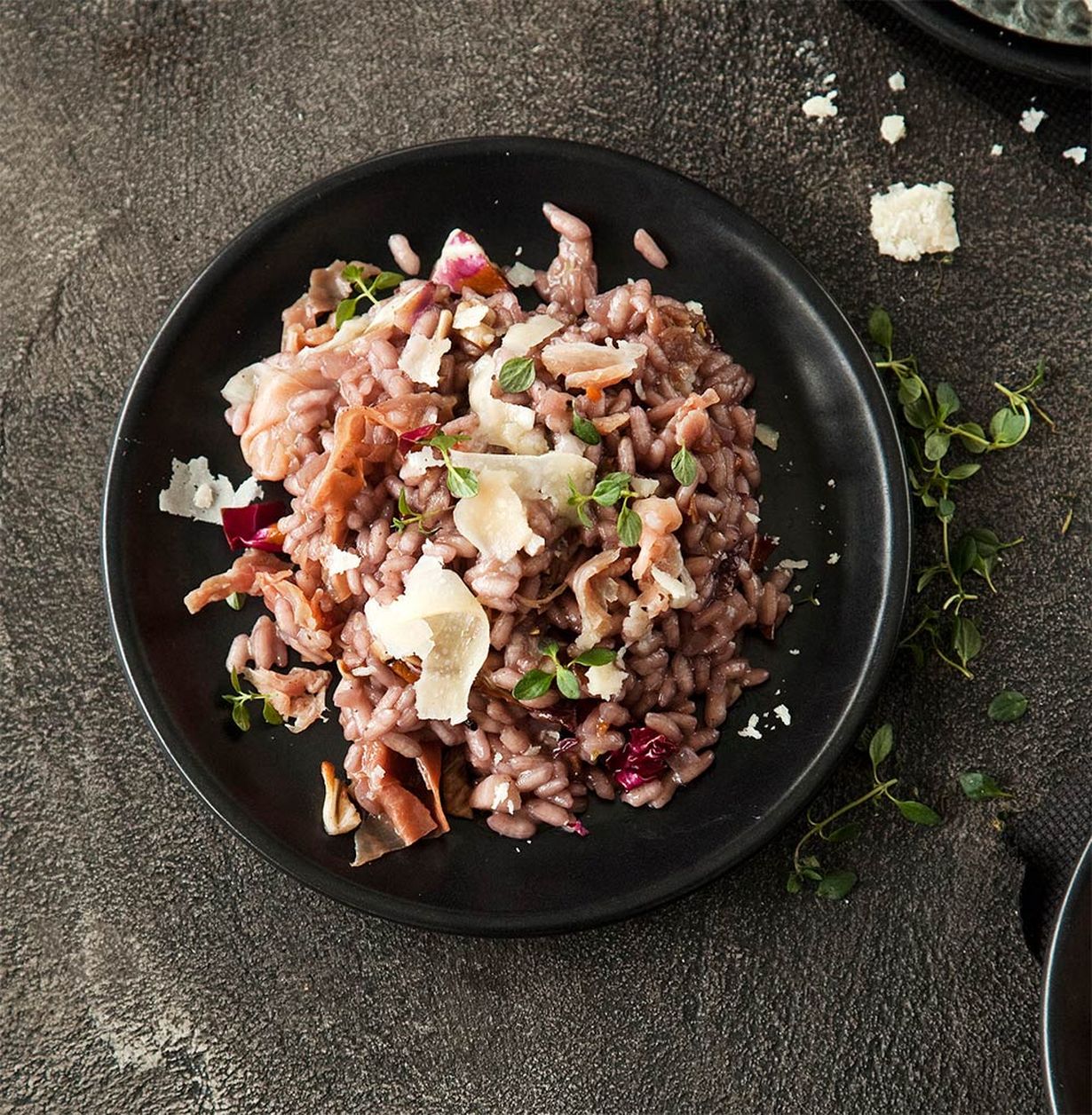 - Valmista risotto perusohjeen mukaan, mutta korvaa valkoviini punaviinillä. Lisää risottoon viinin kanssa muutama oksa timjamia.