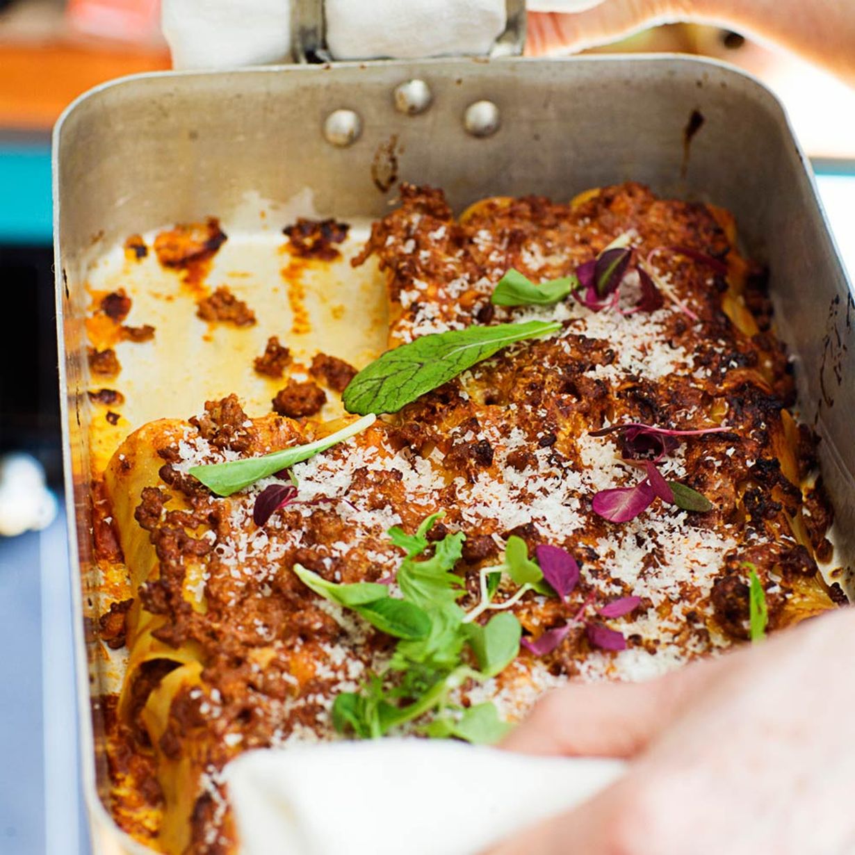 Lado cannellonit voideltuun uunivuokaan ja ripottele päälle reilusti raastettua parmesaania.