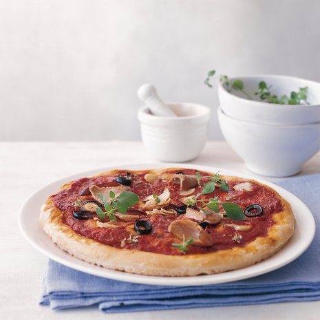 - Levitä kinkkupizzojen pohjille tomaattikastiketta ja päälle siivu mozzarellajuustoa, pari ohutta siivua chiliä ja ripaus rosmariinia. Laita lohipizzojen pohjille smetana-juustokastiketta.