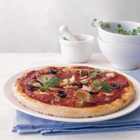 - Valmista pohja. Liuota hiiva kädenlämpöiseen veteen. Lisää öljy ja jauhot. Vaivaa taikina kimmoisaksi ja anna kohota kaksinkertaiseksi lämpimässä paikassa, liinalla peitettynä.