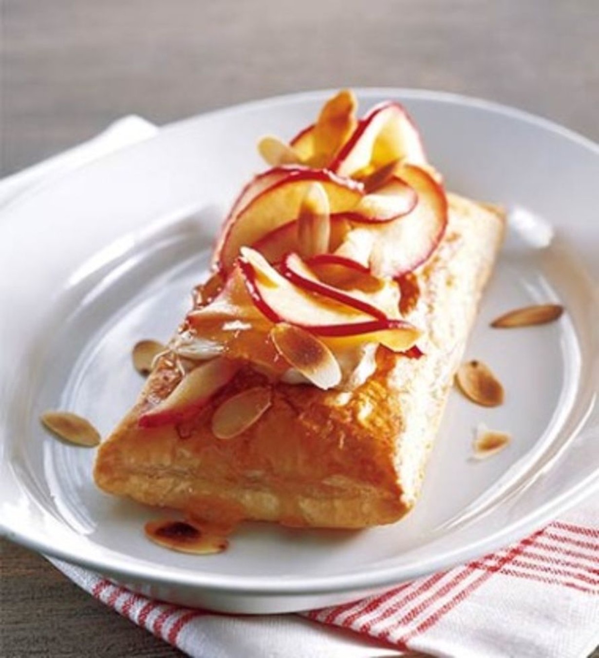 - Lusikoi vuohenjuuston päälle ohut kerros hilloa ja levitä omenaviipaleet. Ripottele koristeeksi mantelilastuja. Tarjoa pikkusuolaisena vaikkapa glögin tai punaviinin kanssa.