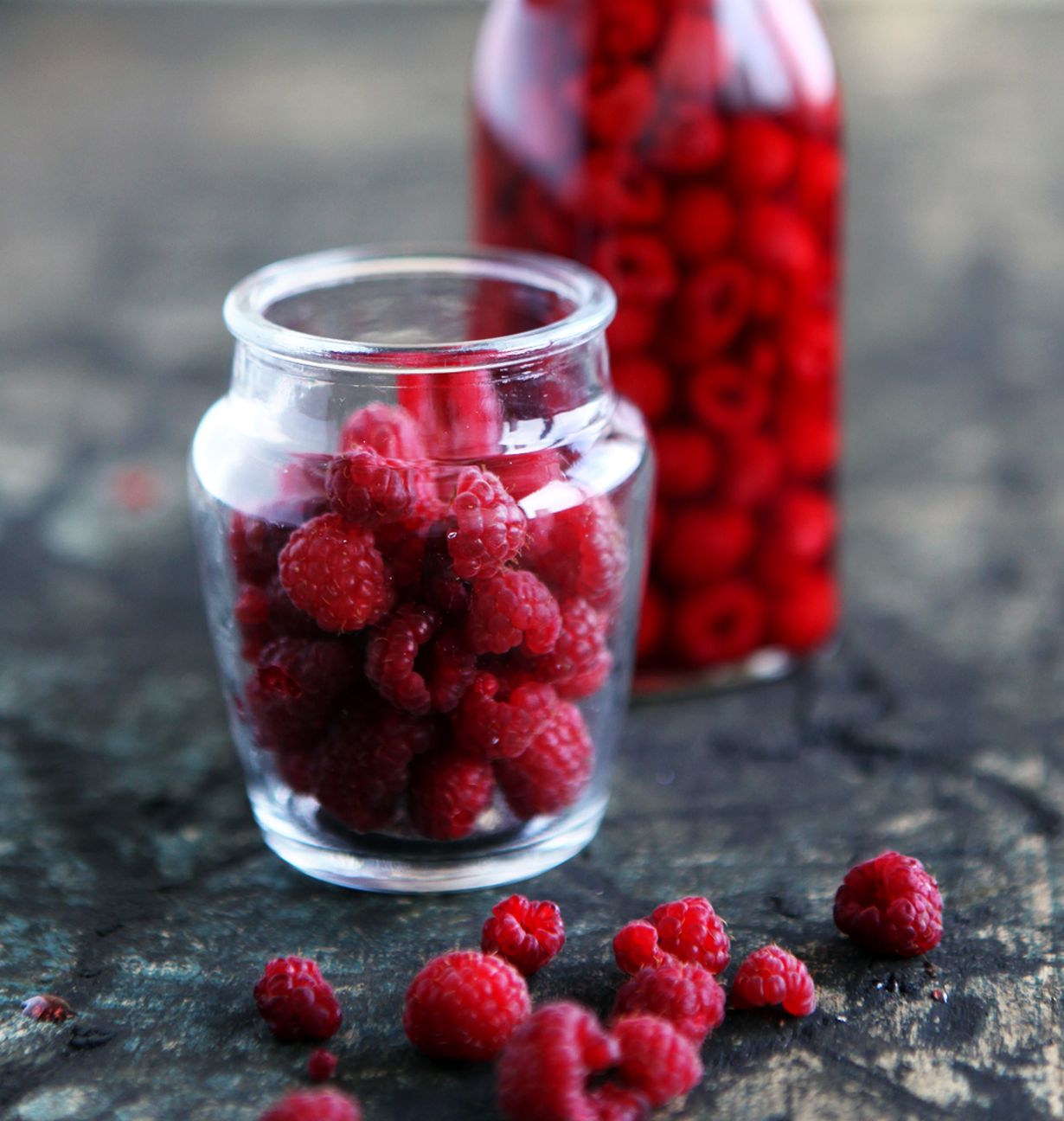 - Lado marjat lasipurkkiin tai -pulloon. Kaada päälle omenaviinietikkaa sen verran, että marjat peittivät. Sulje purkki tai pullo ja aseta ikkunalaudalle valoon uuttumaan. Anna maustua vähintään viikko.