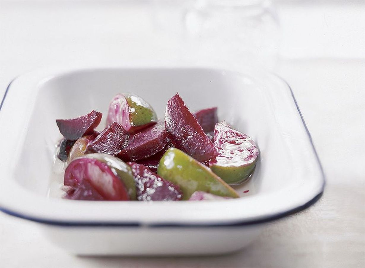 - Kuori ja kuutioi punajuuret leivinpaperilla vuorattuun uunivuokaan.