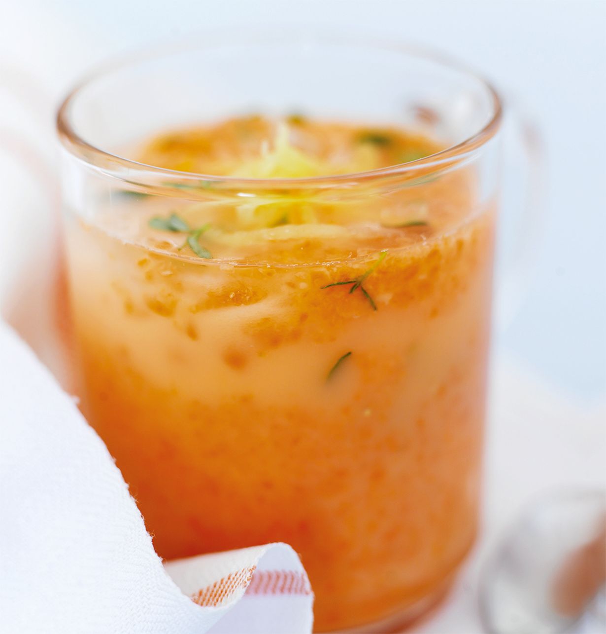 Pakastetusta porkkanasoseesta syntyy viileä keitto kun laimennat porkkanasosetta appelsiinimehulla ja kookosmaidolla, maustat ripauksella chiliä ja timjamia sekä viilennät keiton jäämurskalla.