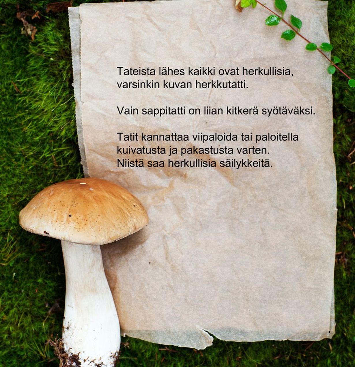 - Tateista lähes kaikki ovat herkullisia, varsinkin kuvan herkkutatti. Vain sappitatti on liian kitkerä syötäväksi. Tatit kannattaa viipaloida tai paloitella kuivatusta ja pakastusta varten. Niistä saa herkullisia säilykkeitä.