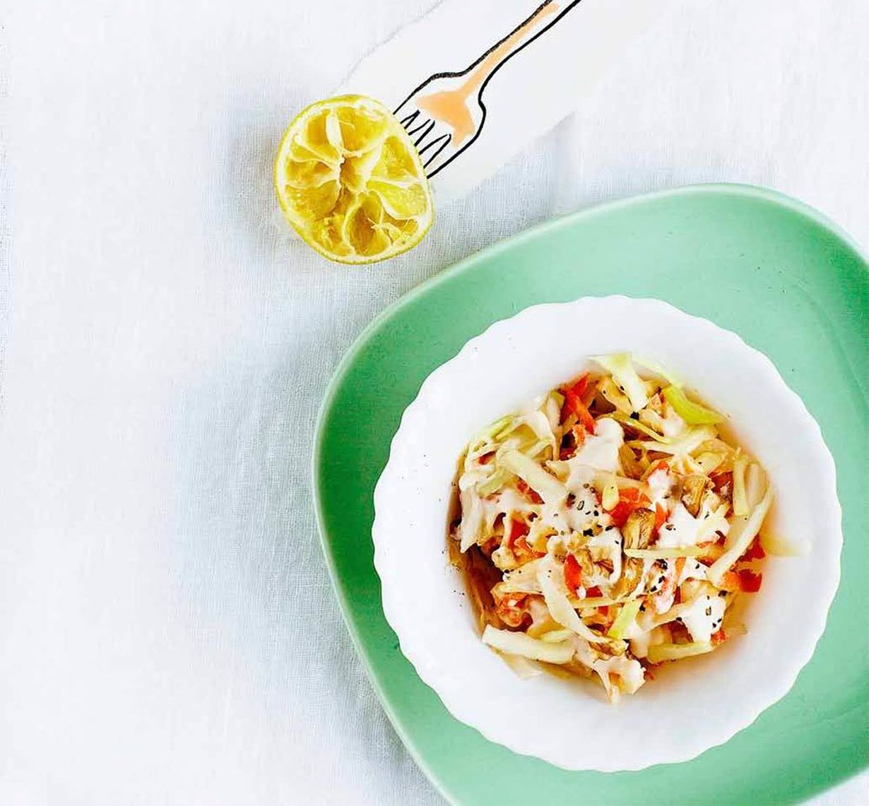 Fenkoli, porkkana ja limettimehu raikastavat pähkinärouheella viimeistellyn kaalisalaatin.