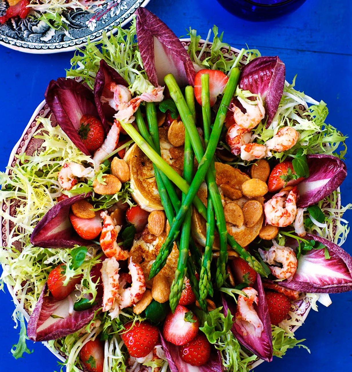Irrota endiivinlehdet. Asettele ne tarjoiluvadin reunoille. Täytä vati salaateilla. Valuta jokiravunpyrstöt. Leikkaa vuohenjuusto viipaleiksi ja ruskista pannulla voissa. Halkaise mansikat.