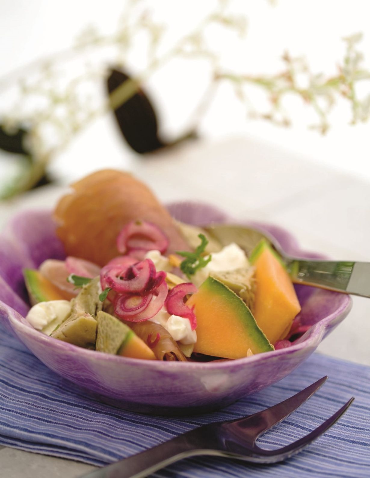 - Kuori ja paloittele meloni tarjoiluastiaan.