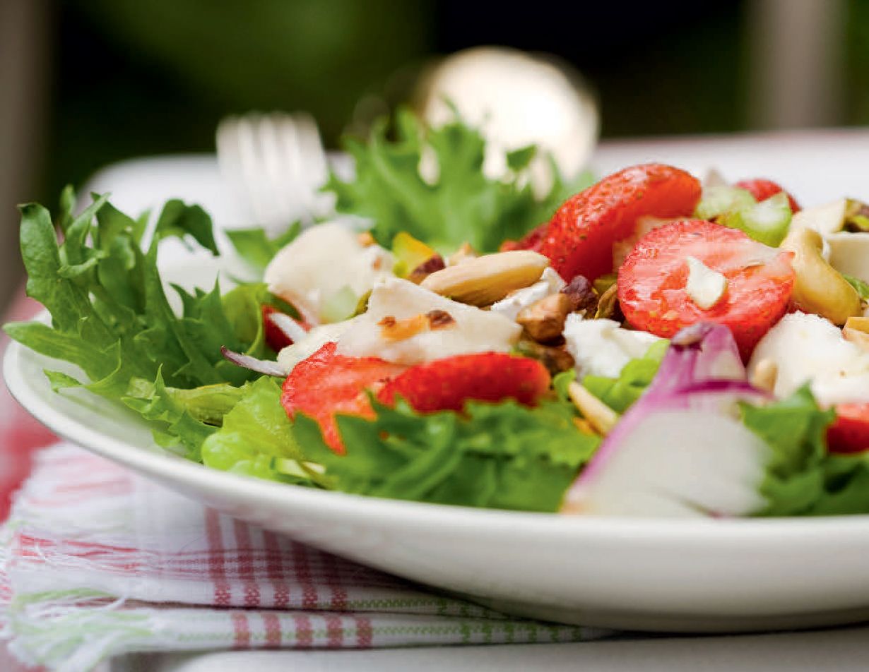 Mansikkasalaatti käy grilliherkkujen lisäkkeeksi tai sellaisenaan aterian alkuun.