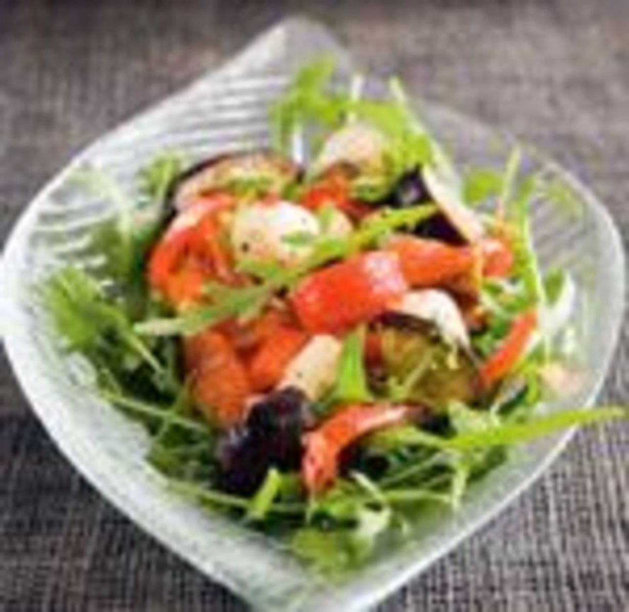 - Lisää mozzarellapallot, valkoviinietikka, öljy, rouhittua mustapippuria ja ripaus suolaa. Sekoita. Nosta rucolaa pediksi salaattivadille ja nostele paprikaseosta päälle.