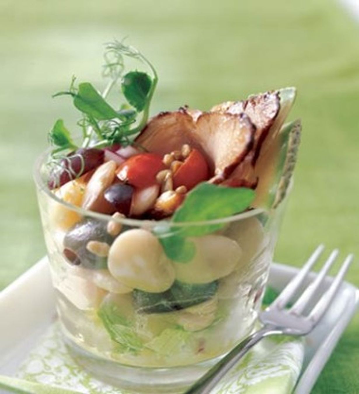Salaatin pohjana ovat marinoidut pavut ja perunat.