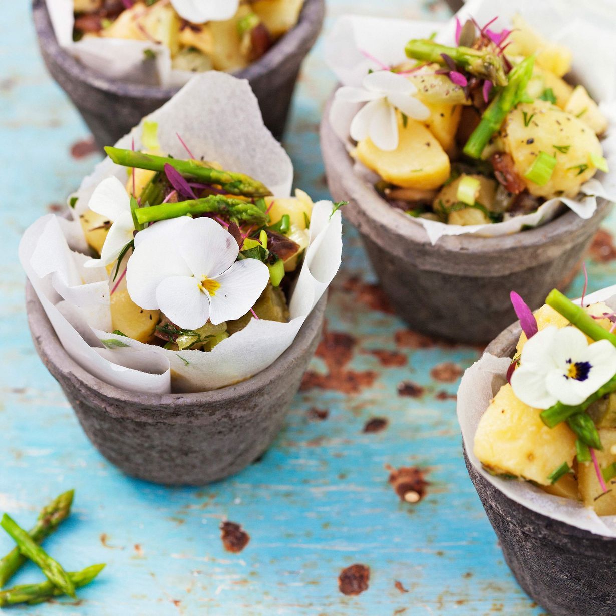 Keväinen parsa-perunasalaatti tarjotaan pienistä voipaperilla vuoratuista ruukuista – kukkasenkeveällä koristelulla.