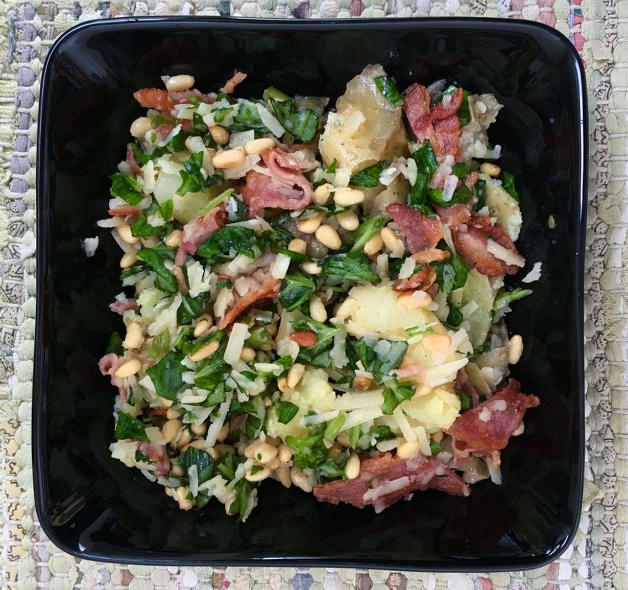 Ronskeiksi paloiksi jätetyt perunat, juuri paahdettu pekoni ja pestosta tutut maut ovat vastustamattomia yhdessä.