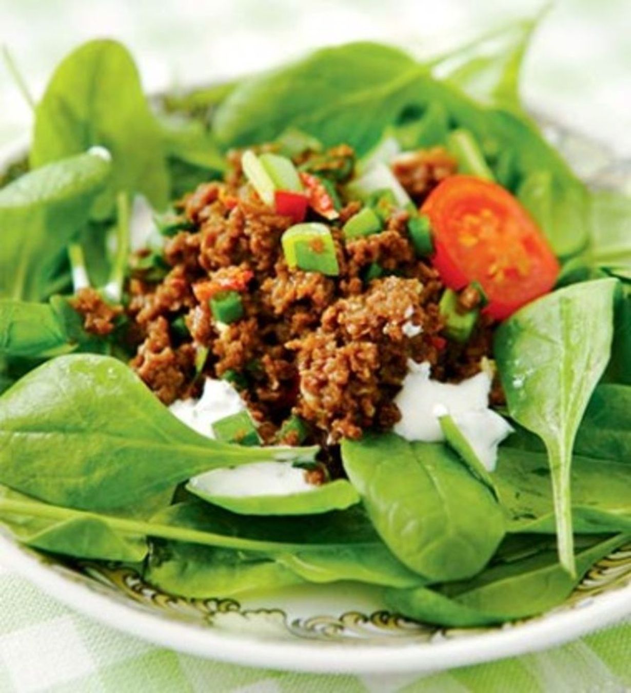 - Huuhtele pinaatinlehdet. Hienonna kevätsipulinvarret. Viipaloi kurkku. Halkaise kirsikkatomaatit. Sekoita soijarouheseos ja vihannekset kulhossa.