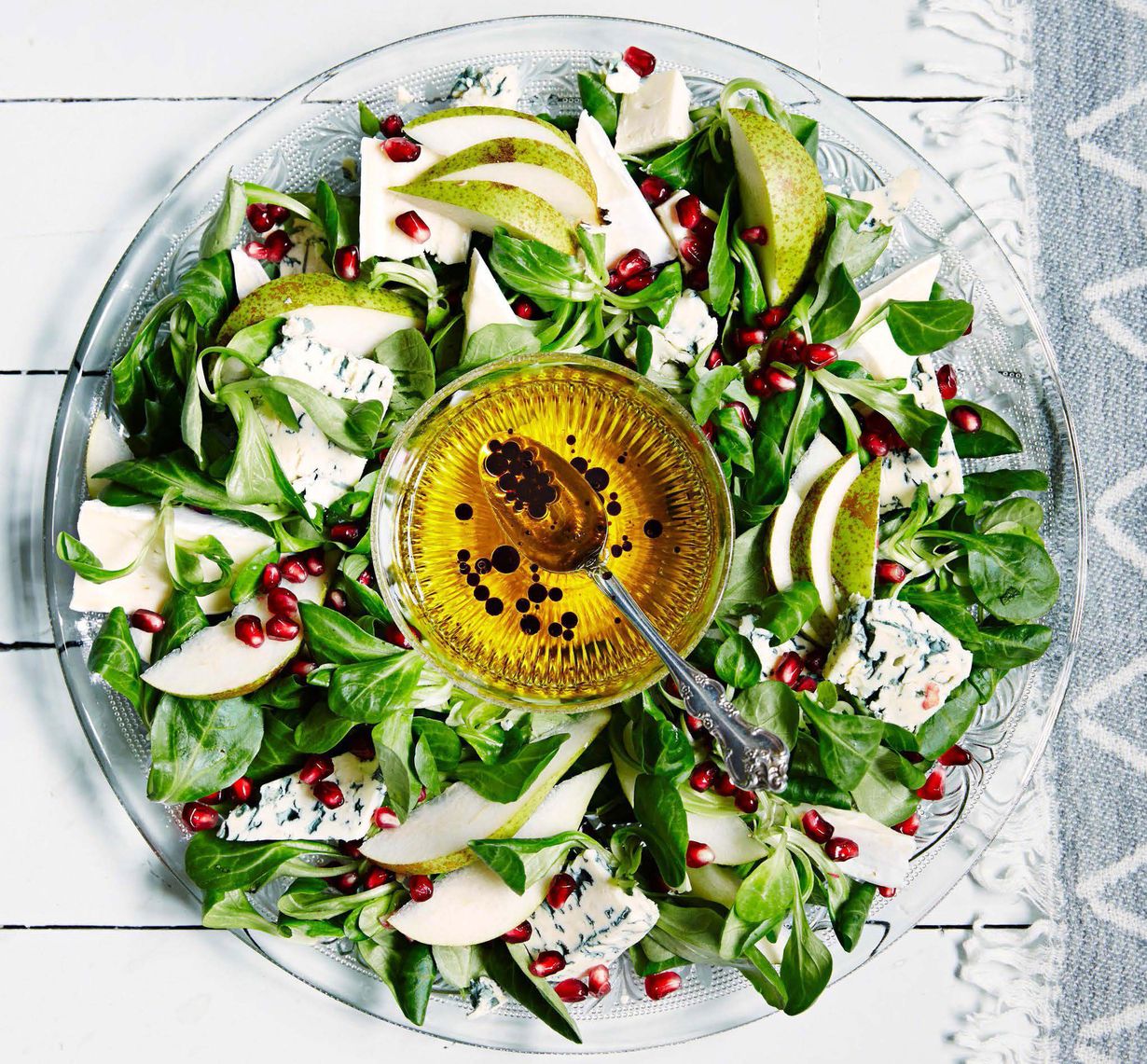 - Asettele vuonankaalia kulhon ympärille. Laita juustopaloja ja päärynäviipaleita tasaisesti salaatin päälle. Ripottele pinnalle granaattiomenan siemeniä.