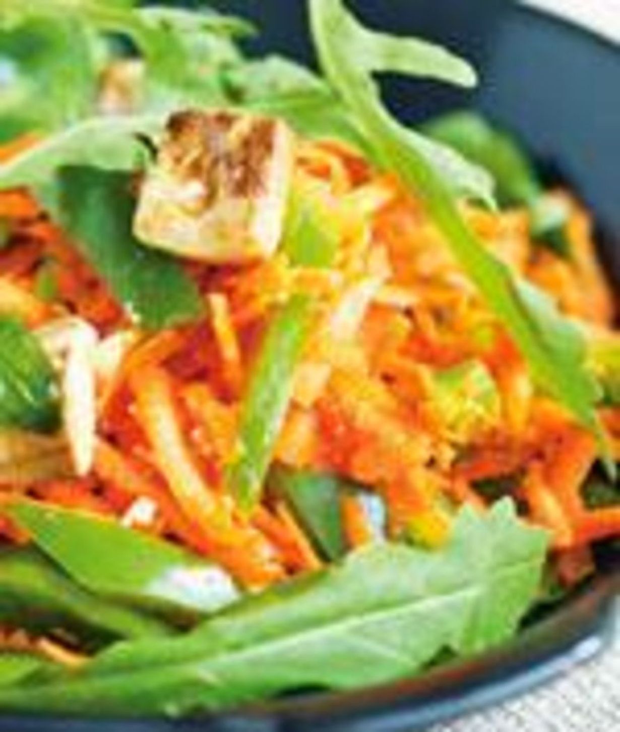 - Kuori ja raasta porkkanat, viipaloi paprika ja silppua sipuli. Sekoita tofun ja rucolan kanssa salaatiksi. Halutessasi voit kaataa sekaan lorauksen oliiviöljyä.