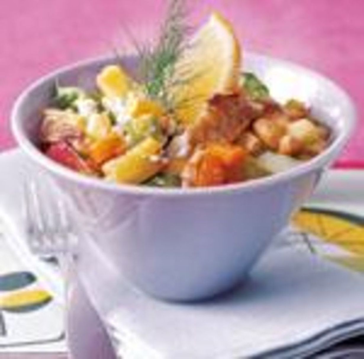 1. Huuhdo ja revi salaatti isoon kulhoon. Pilko joukkoon pestyt persikat tai nektariinit, tilli, kurkku ja paprika.