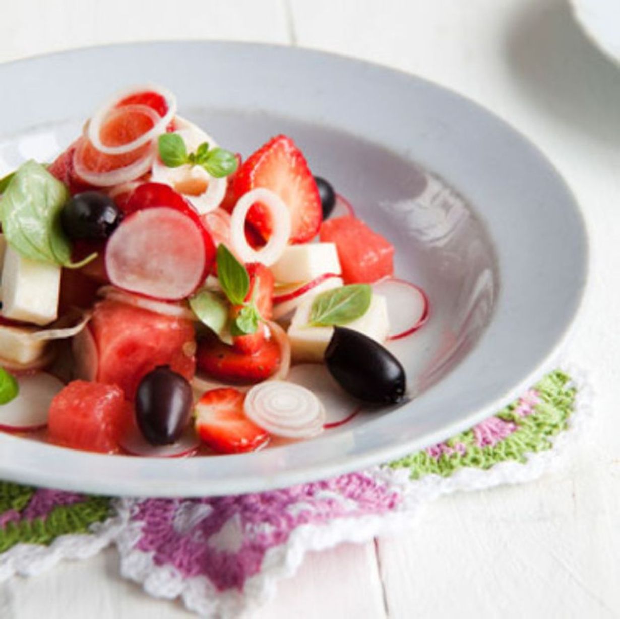 - Poista vesimelonista siemenet ja kuutioi hedelmäliha. Perkaa mansikat ja puolita tai viipaloi ne. Viipaloi kesäsipulit varsinen. Viipaloi retiisit ohuiksi.