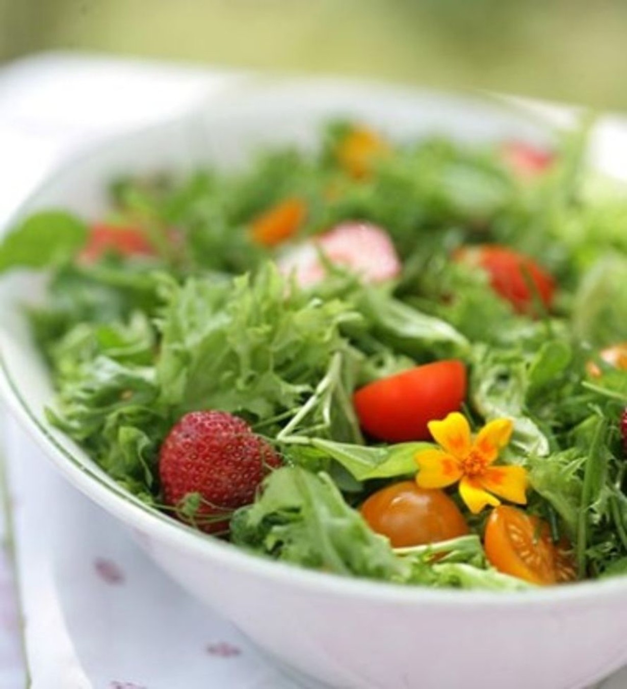 - Halkaise kirsikkatomaatit ja pilko mansikat. Pyörittele revityt salaatinlehdet valkoisessa balsamiviinietikassa. Sekoita salaattiaineet.