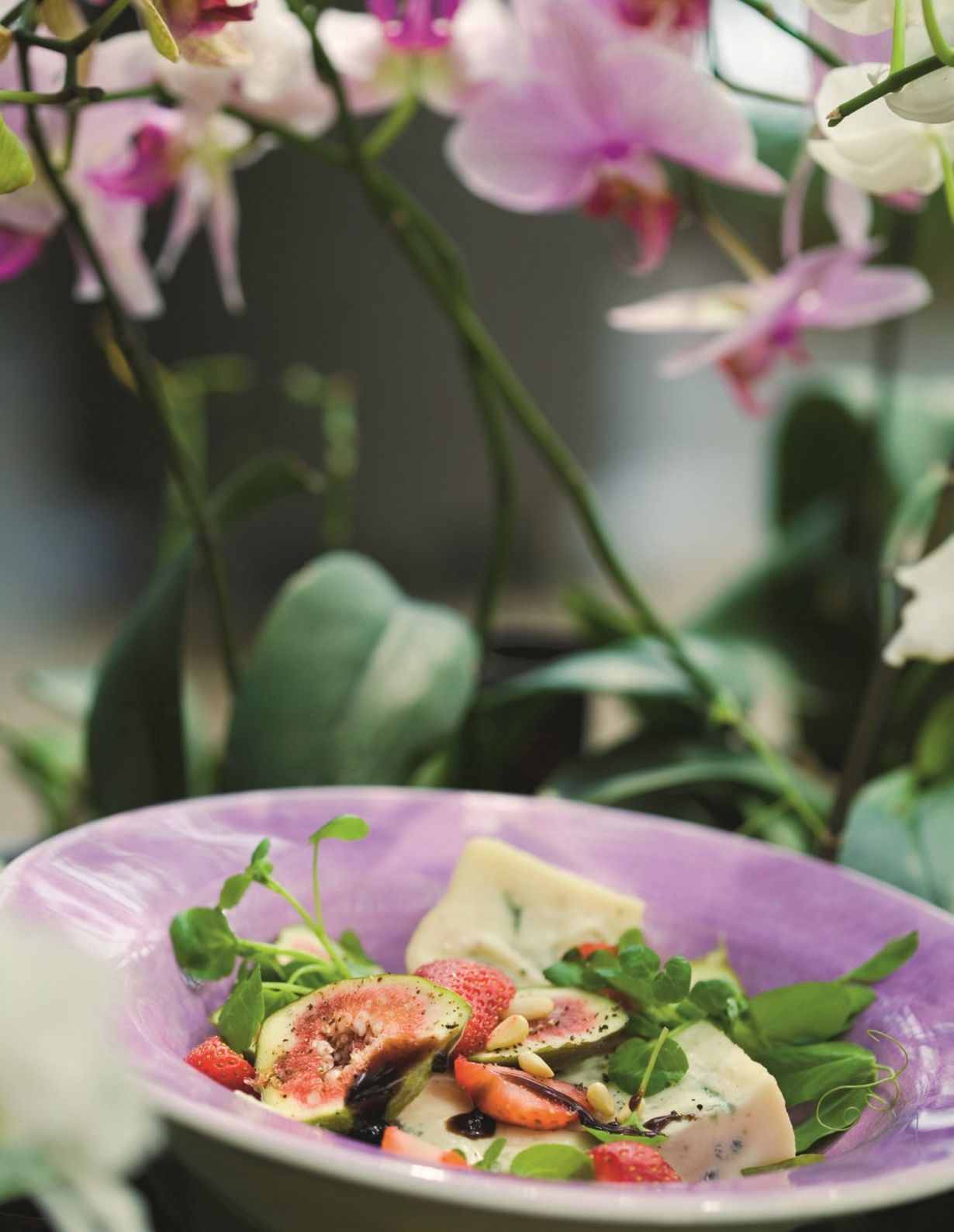- Kokoa salaatti. Pane pohjalle salaattia ja viipaloitua juustoa. Nosta päälle viikunat ja mansikat ja ripottele pintaan pinjansiemenet. Viimeistele balsamicosiirapilla.